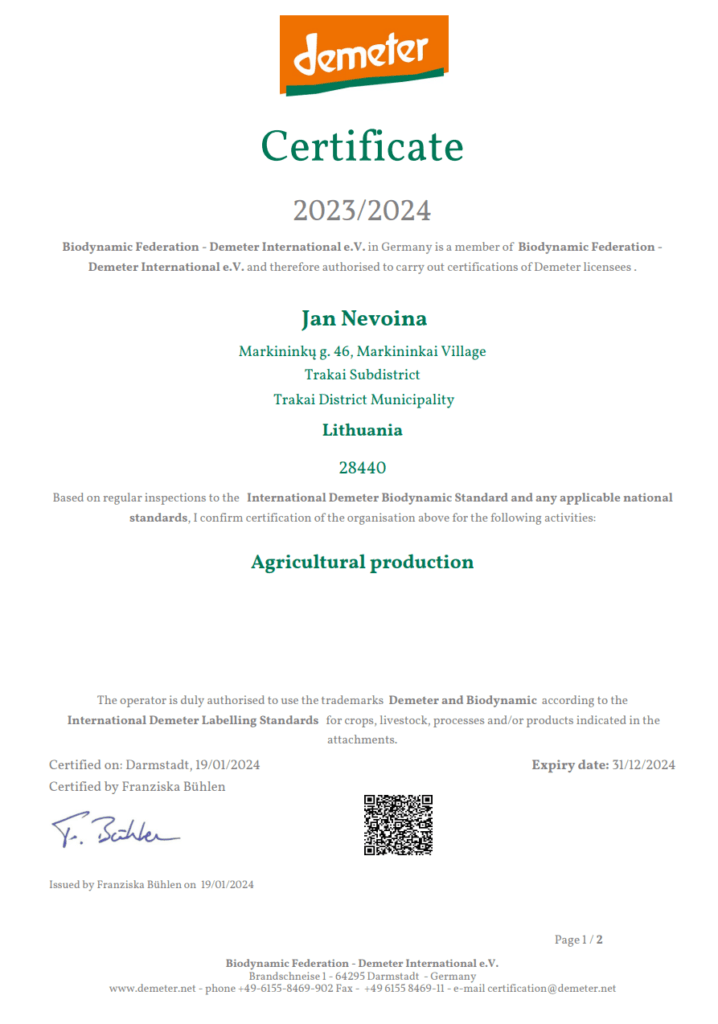 BioSodas.lt – tai ūkis, kuris dovanoja biodinamines gėrybes. 2014 metais, ūkininkas Jan Nevoina su žmona Veronika Nevoina gavo “Demeter” kokybės sertifikatą, įrodantį, jog visos augintos gerybės turi biodinaminį statusą bei auginamos su geriausiom technologijom bei aukščiausia klase. Biosodas ūkyje auginami prieskoniniai augalai, įvairios daržovės, uogos bei daug daugiau – atnešdami sveikatą bei vitaminus. Šiandien, mes norime pasidalinti savo biodinaminėmis gerybėmis su žmonėmis, kurie palaiko sveiką gyvenimo būdą ir nori šviežių daržovių tiesiai į namus!